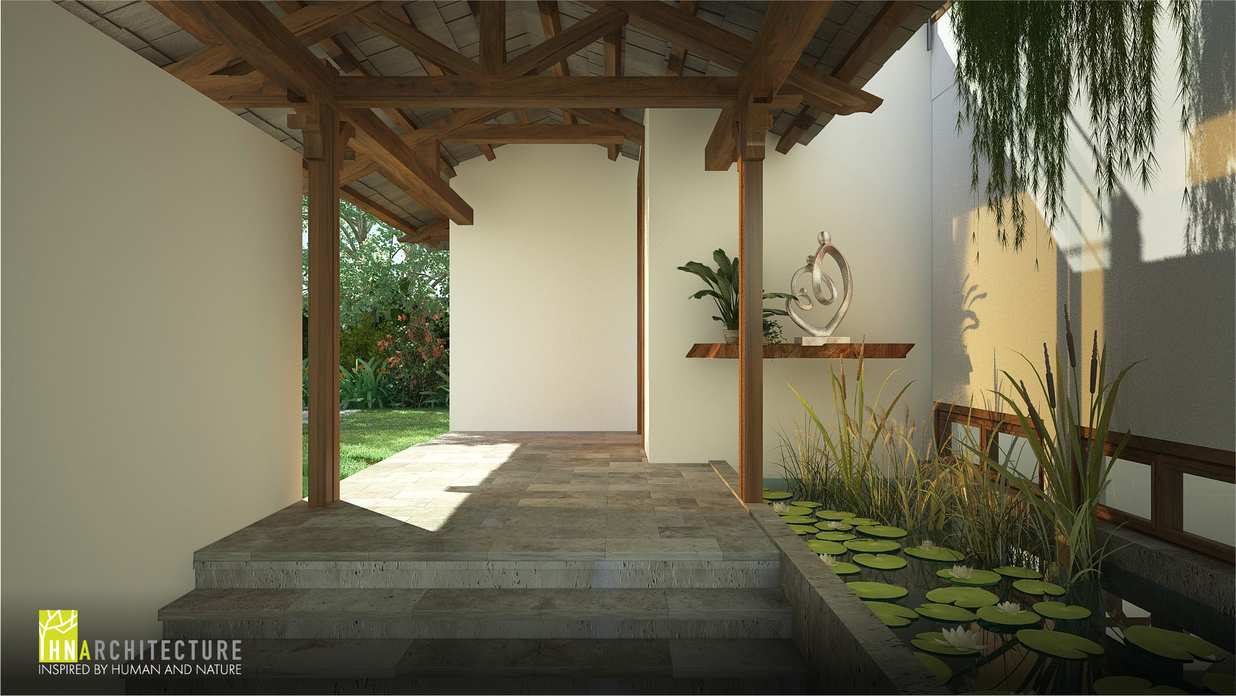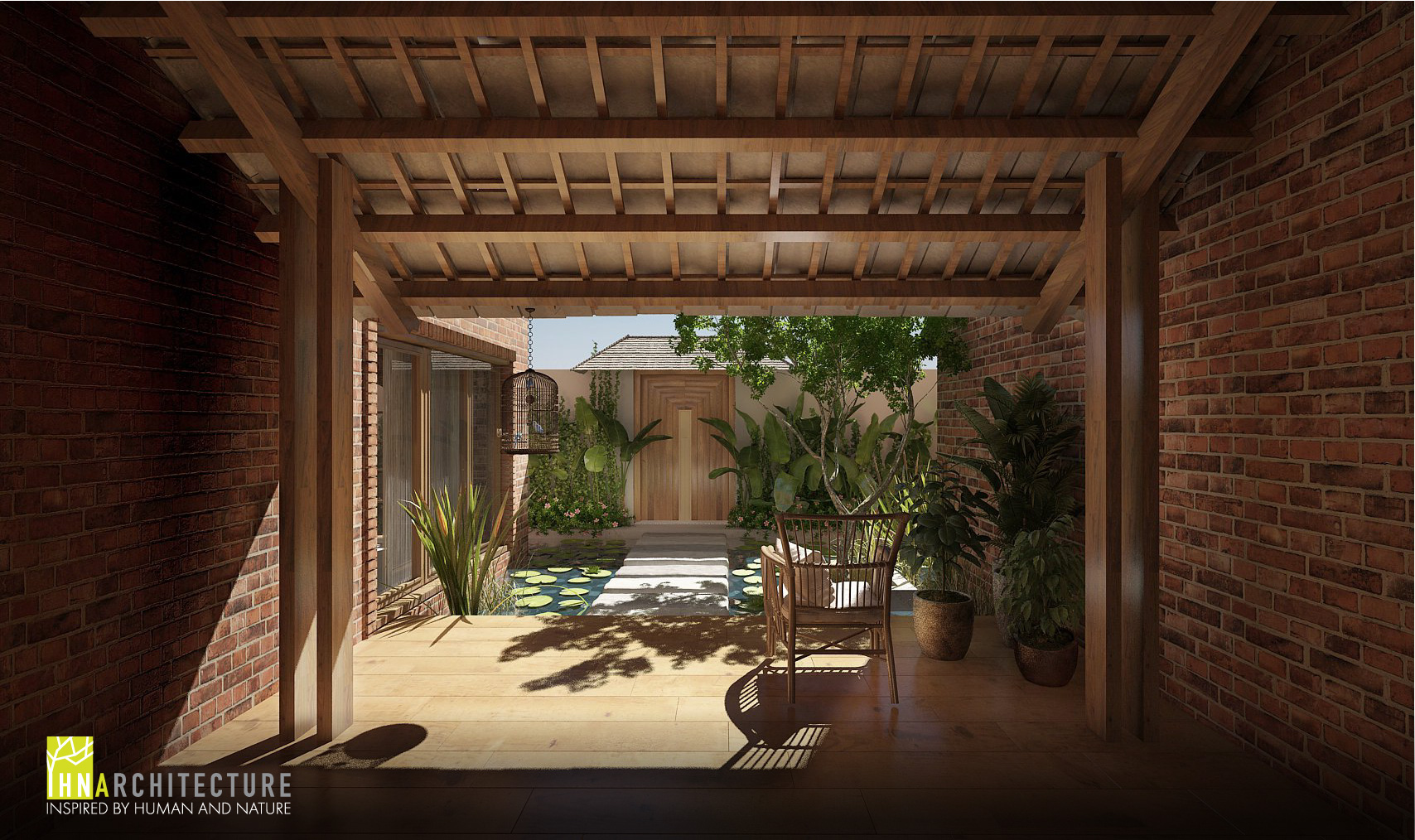 Đi qua cổng vào sân nhà là cảm nhận được ngay sự trong lành tràn ngập hương vị của tự nhiên, của cây lá, của gạch nung, của mái ngói được đỡ bởi hệ vì kèo gỗ duyên dáng và tinh tế.